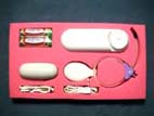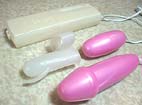 ペニス型ミニバイブ、ローター、ローターに付けて使用するサックが付いています。