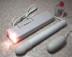 防水加工を施したローターです。 大きい方が、バッテリーボックスとコントローラーになっていて、振動はしません。コードは、水中使用での断線の危険を考慮して、伸びるコードになっています。